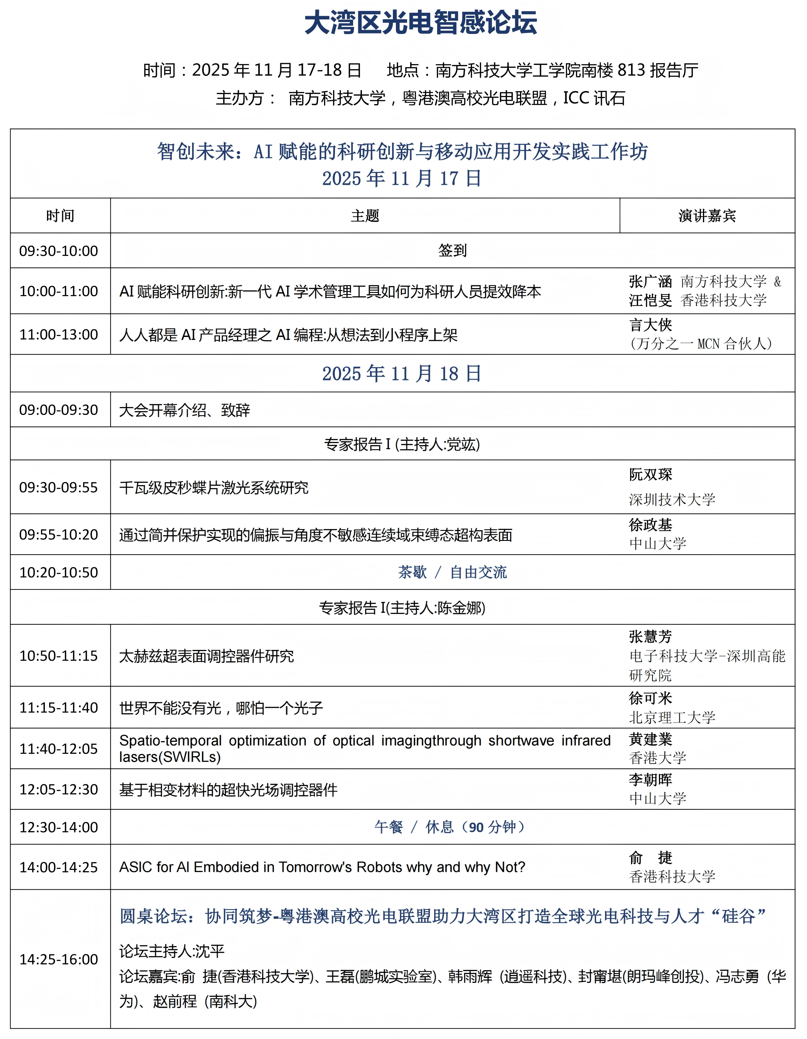 ICC訊 2025 年 11 月 17-18 日,深圳南方科技大學(xué)工學(xué)院南樓 813 報(bào)告廳將迎來(lái)一場(chǎng)光電產(chǎn)業(yè)論壇 —— 大灣區(qū)光電智感論壇。本次論壇由粵港澳高校光電聯(lián)盟、南方科技大學(xué)、ICC 訊石聯(lián)合主辦,在《粵港澳大灣區(qū)發(fā)展規(guī)劃綱要》戰(zhàn)略指引下,聚焦光電領(lǐng)域前沿突破,搭建產(chǎn)學(xué)研深度融合橋梁,對(duì)企業(yè)而言,是搶占技術(shù)高地、鏈接優(yōu)質(zhì)資源、拓展發(fā)展空間的關(guān)鍵契機(jī)。ICC訊石誠(chéng)邀光電產(chǎn)業(yè)精英報(bào)名參會(huì)。