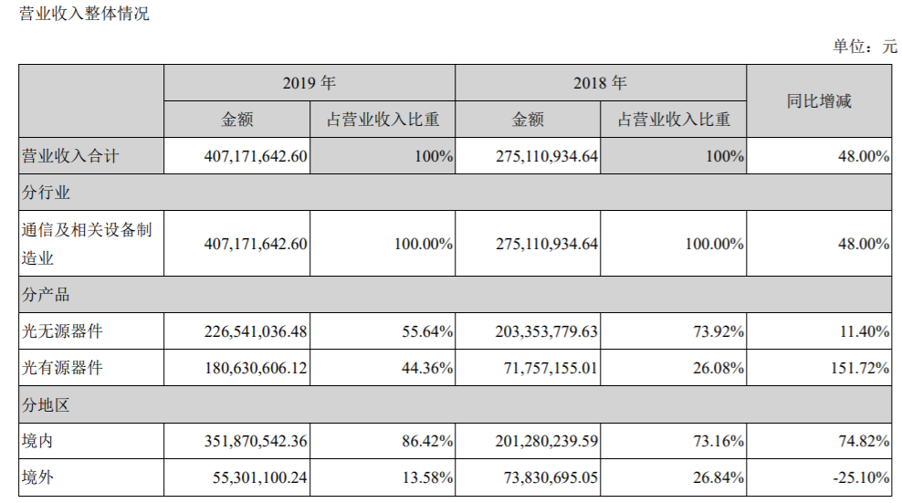 市場(chǎng)表現(xiàn)情況,報(bào)告期內(nèi),國內(nèi)電信運(yùn)營(yíng)商資本支出恢復(fù)增長(zhǎng),DWDM器件需求增加,運(yùn)營(yíng)商對(duì)10G PON建設(shè)持續(xù)投入。公司2019年實(shí)現(xiàn)境內(nèi)銷售收入3.52億元,比上年同期增長(zhǎng)74.82%,占總銷售收入的86.42%。在境外市場(chǎng)方面,光分路器市場(chǎng)需求較為穩(wěn)定,ROSA銷售萎縮。公司2019年實(shí)現(xiàn)境外銷售收入0.55億元,比上年同期下降25.10%,占總銷售收入的13.58%。