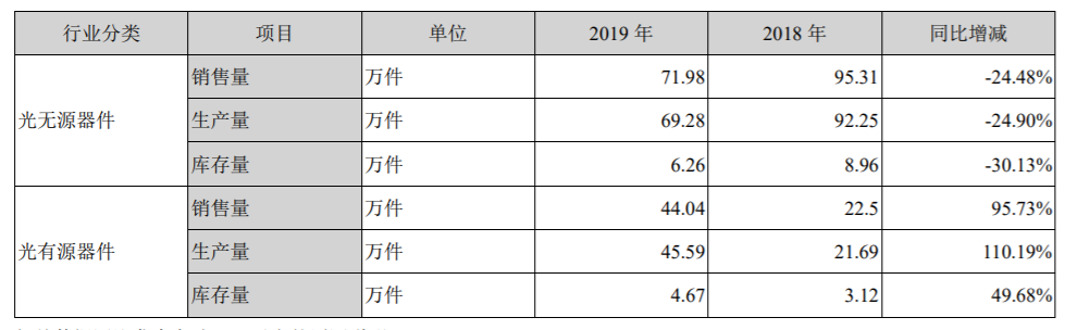 博創(chuàng)科技2019年光器件產(chǎn)銷情況(圖源:2019年報(bào))