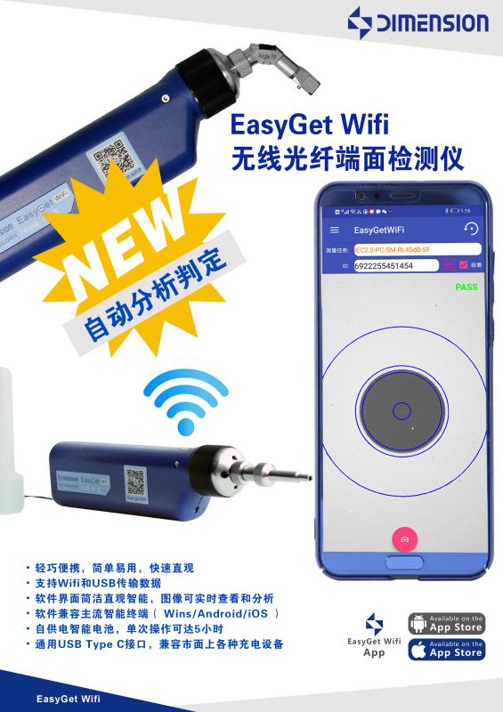 EasyGet Wifi是最輕巧便攜的無線光纖端檢儀,通過Wifi實現(xiàn)和多種智能終端間實時傳輸視頻、拍照、存儲等,用戶可以直觀地查看光纖端面質量,升級后新增自動分析判定功能,用戶可以免費升級應用,使其成為現(xiàn)場技術人員最實用的光纖端面檢測工具。