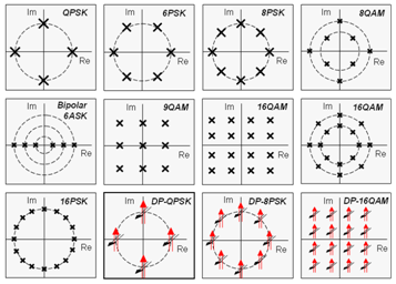 多維度、多進制調制技術可在一個符號上承載多個比特信息,能夠有效提高頻譜效率,降低符號發(fā)送的波特率,減小基帶帶寬及與之相關的色度色散和偏振模色散,減小對傳輸通道和光電器件帶寬的要求。