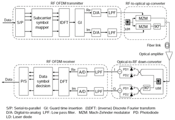 OFDM的應用具有如下優(yōu)勢:子頻帶割分降低了系統(tǒng)對光電器件的帶寬要求,增強了光電器件和模塊選擇的靈活性;導頻副載波便于信道和相位估計;提高了頻譜資源利用率,具有很好的可擴展性。