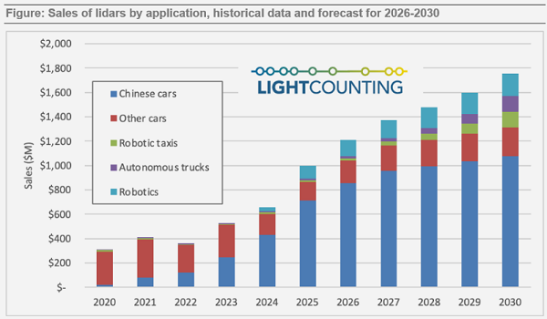 機器人技術(shù)顯然推動了這一增長,但其中大部分貢獻來自車載激光雷達。我們在去年曾報道中國電動汽車制造商對激光雷達的需求蓬勃興起,而這一市場在2025年的表現(xiàn)超出了我們的預(yù)期。
