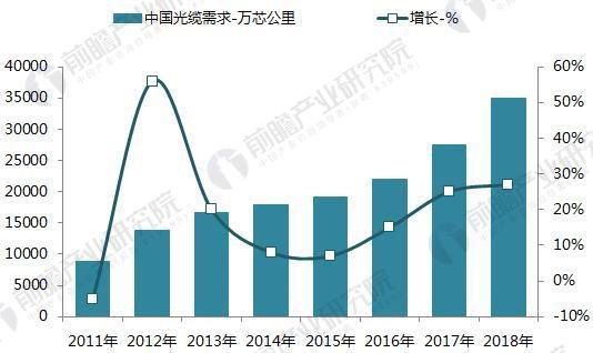 圖表 4:2011-2018 年中國光纜需求及增長預(yù)測(單位:萬芯公里,%)