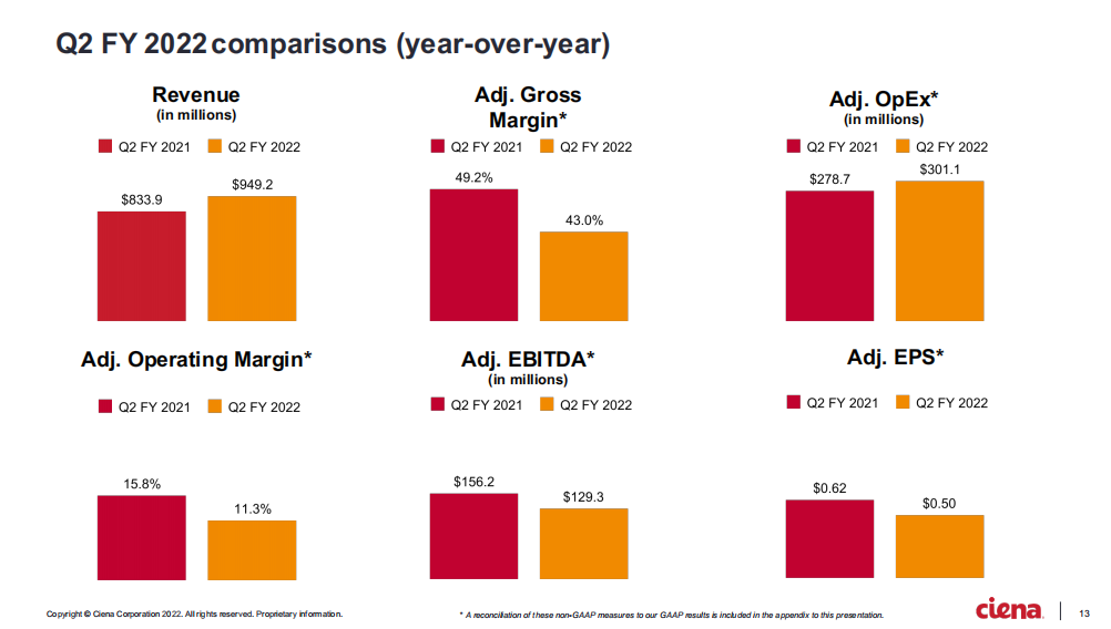 2022財年第二季度,Ciena營收為9.49億美元,去年同期為8.34億美元,同比增長13.8%。2022財年二季度毛利率為42.3%,去年同期為49.5%,同比下滑7.2%。2022財年二季度凈收入3890萬美元,每股收益0.25美元,去年同期凈收入1.03億美元,每股收益0.66美元。Ciena 2021 財年第二季度的 GAAP 凈收入受益于加拿大緊急工資補貼計劃的 4040 萬美元稅前金額,該計劃于 2021年10月到期。