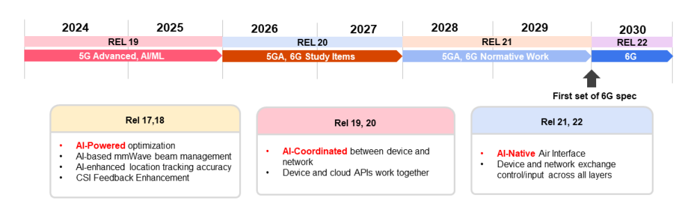 AI能力最早出現(xiàn)在3GPP Release 17版本中,并在Release 18中得到擴展。未來的版本預計將從AI協(xié)同網絡(AI管理離散網絡功能)向AI原生架構(AI深度嵌入整個網絡堆棧)過渡(圖1)。在6G時代,AI將滲透每一層,釋放前所未有的性能與自動化水平。盡管3GPP標準并未覆蓋所有層級,但創(chuàng)新正在貫穿整個網絡堆棧,部分供應商和運營商已開始在網絡中直接部署AI模型。