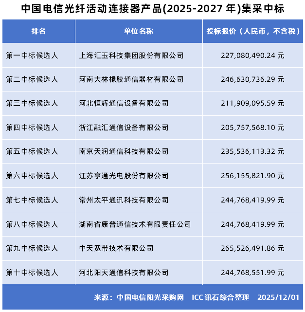 ICC訊 2025年12月1日,中國(guó)電信于陽(yáng)光采購(gòu)網(wǎng)發(fā)布《中國(guó)電信光纖活動(dòng)連接器產(chǎn)品(2025年-2027年)集中采購(gòu)項(xiàng)目中標(biāo)候選人公示》。據(jù)公示顯示,本輪集采匯玨科技、亨通光電、中天寬帶等十家企業(yè)成功入選,涵蓋從東部沿海到中部地區(qū)的多家通信設(shè)備制造商。