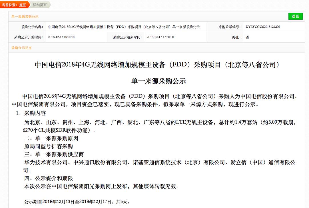 ICCSZ訊 近日,中國電信公示了2018年4G無線網(wǎng)絡(luò)增加規(guī)模主設(shè)備(FDD)采購項(xiàng)目(北京等八省公司)單一來源采購供應(yīng)商名單。此次共有四家企業(yè)入選。