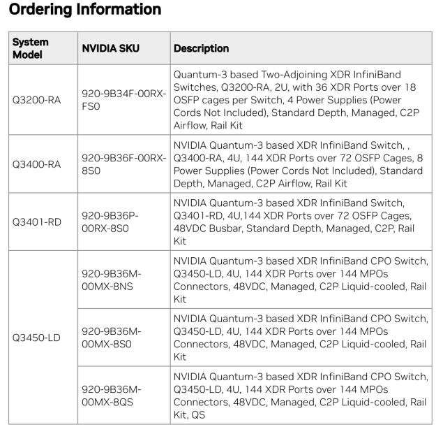 針對CPO交換機Quantum 3450-LD,本次英偉達推出了三個型號:920-9B36M-00MX-8NS、920-9B36M-00MX-8S0、920-9B36M-00MX-8QS,三者參數(shù)基本一致:4U機架式、144個XDR端口、144個MPO連接器、48V直流供電、液冷方案、含線纜套件。