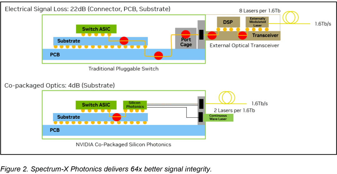 具體來看,對于傳統(tǒng)可插拔光模塊,信號首先從Switch ASIC中發(fā)出,然后經(jīng)過電路板和連接器,然后才被轉(zhuǎn)換成光,這種方式會產(chǎn)生比較嚴重的信號衰減,例如在200Gb/s的傳統(tǒng)中可達約22分貝。CPO通過將光學引擎封裝在Switch ASIC旁邊,縮短了芯片和模塊之間的走線距離,光信號幾乎立即耦合到光纖內(nèi),而不是經(jīng)過長線路傳輸,因此,信號衰減被降低到4分貝,信號衰減減少了80%。