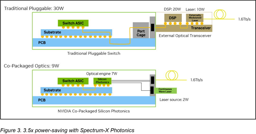 除此之外,在傳統(tǒng)可插拔光模塊方案中,為了補救信號衰減的問題,就不得將端口功率提高到30W,而這又會反過來引起新的問題(例如需要額外散熱并產(chǎn)生潛在故障點),據(jù)英偉達表述,隨著AI集群規(guī)模的擴大,這一損失幾乎難以忍受。采用CPO方案后,每個端口的功耗從30W降低到9W,降幅約70%,并且CPO方案中光器件數(shù)量顯著減少,大大簡化了光互連的實現(xiàn)。