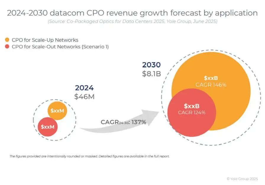 再例如,Yole Group認為CPO在2024年市場規(guī)模約4600萬美元,2025年的市場規(guī)模約1億美元,2026~2027年將快速提高滲透率,2028~2030年CPO將大規(guī)模替代可插拔模塊,到2030年CPO市場規(guī)模將達到81億美元,CAGR高達137%。