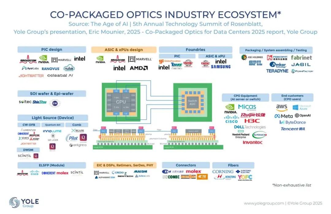 Yole Group給出了一張CPO產(chǎn)業(yè)鏈的全景圖,涉及的A股上市公司包括但不限于太辰光(114.310, -7.40, -6.08%)(300570.SZ)、銳捷網(wǎng)絡(luò)(78.820, -4.71, -5.64%)(301165.SZ)等等,但這張圖對A股上市公司的描述未必全面,例如缺少CPO重要玩家天孚通信(209.620, -5.54, -2.57%)(300394.SZ)等A股上市公司。