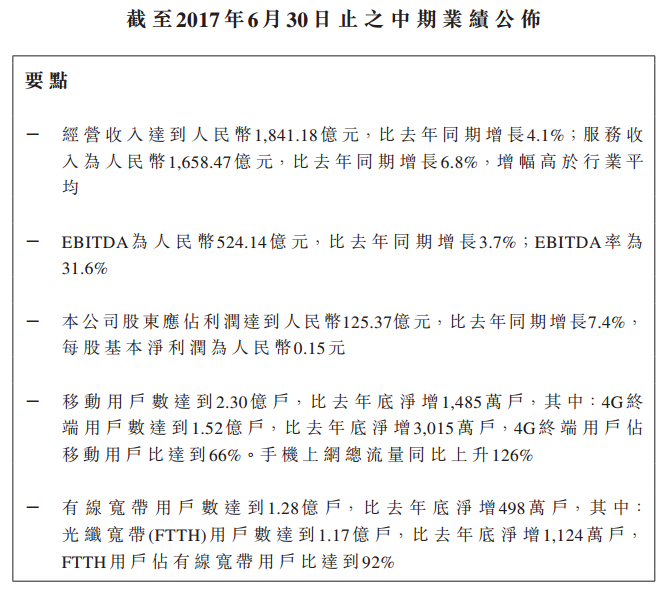 ICCSZ訊 8月23日,中國電信正式發(fā)布了截至2017年上半年的中期報(bào)告:報(bào)告期內(nèi),中國電信實(shí)現(xiàn)經(jīng)營收入到1841.18億元,比去年同期增長4.1%;服務(wù)收入為1658.47億元,比去年同期增長6.8%,增幅高于行業(yè)平均;移動收入服務(wù)達(dá)到757億元,同比增長12.2%,增幅行業(yè)領(lǐng)先。新興業(yè)務(wù)收入占服務(wù)收入比為45.0%,較去年同期增長提升6.1個(gè)百分點(diǎn)。EBITDA3位人民幣524億元,同比增長3.7%,EBITDA率3為31.6%。