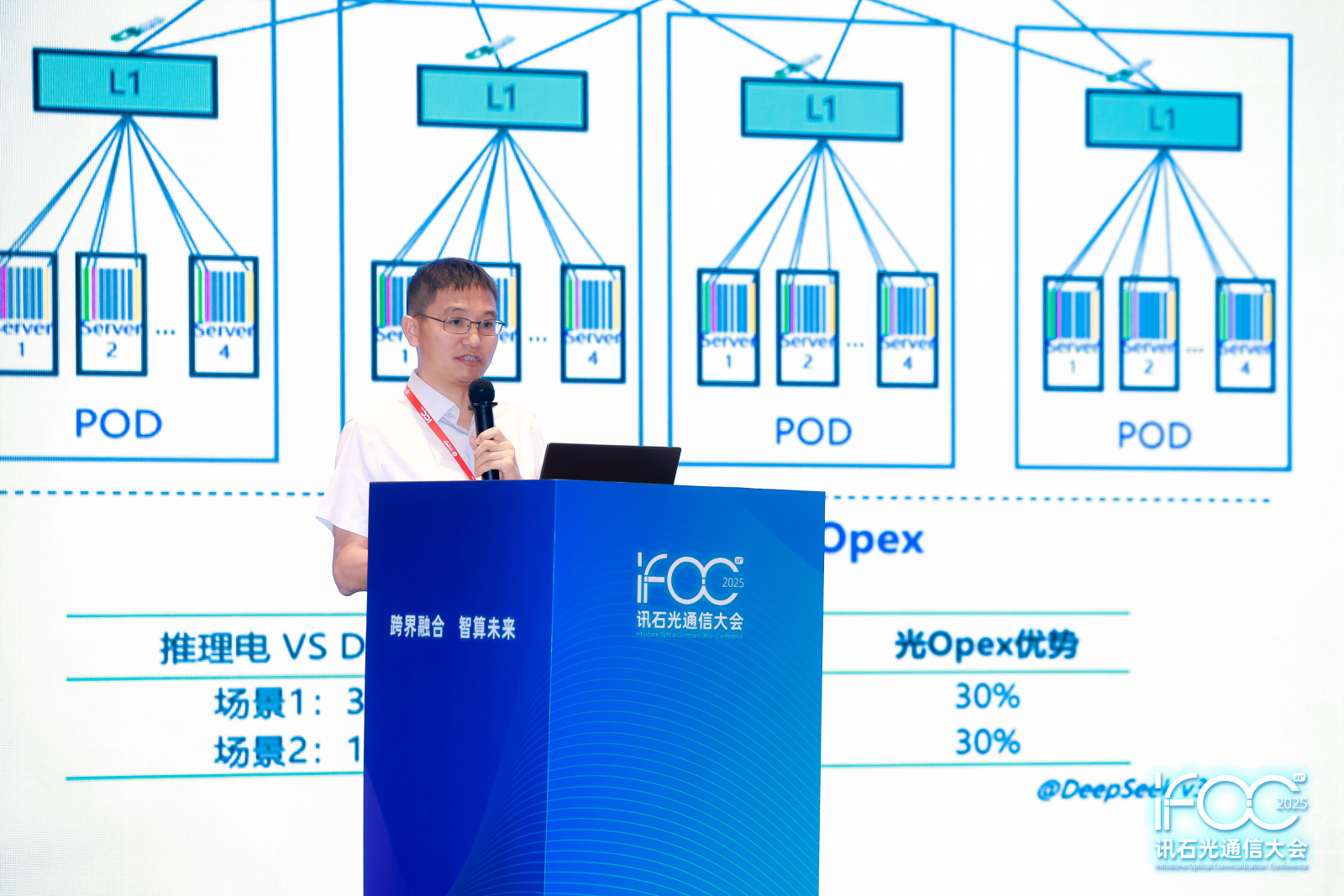 華為光產(chǎn)品線技術(shù)規(guī)劃專家孫光輝發(fā)表《光互聯(lián)助力AI算力釋放》,孫總在演講中系統(tǒng)闡述了光互聯(lián)技術(shù)在AI算力釋放中的關(guān)鍵作用與解決方案。他指出,受國產(chǎn)芯片制程限制,“以光補(bǔ)電”成為支撐算力大規(guī)模擴(kuò)展的重要路徑,可顯著降低CapEx、功耗并提升吞吐量。同時(shí)重點(diǎn)介紹了DC-OXC(光線路交換)技術(shù)在智算參數(shù)面與超節(jié)點(diǎn)互聯(lián)中的應(yīng)用,其具備速率無關(guān)、協(xié)議透明、低時(shí)延、低功耗和高可靠性等優(yōu)勢,適用于大規(guī)模、可預(yù)測的AI訓(xùn)練流量。通過光電混合方案,實(shí)測顯示訓(xùn)練時(shí)延降低14%,訓(xùn)練時(shí)間減少2%,備份資源池化可提升資源利用率約10%。華為聯(lián)合業(yè)界推動(dòng)OCS標(biāo)準(zhǔn)化,助力構(gòu)建高效、靈活、綠色的智算網(wǎng)絡(luò)基礎(chǔ)設(shè)施。