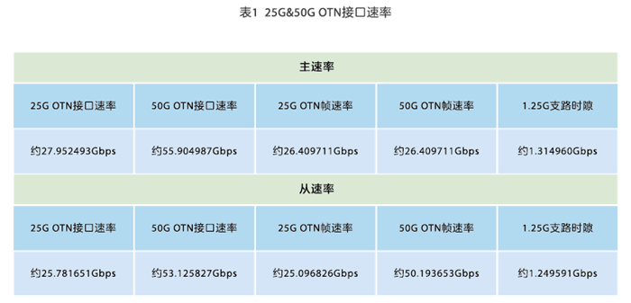 傳統(tǒng)OTN接口的速率只有一個,新定義的25G&50G OTN接口將會是雙速率的,即一個接口,兩種速率;25G OTN接口主速率約為27.95Gbps,從速率約為25.78Gbps;50G OTN接口主速率約為55.905Gbps,從速率約為53.125Gbps。定義雙速率25G&50G OTN接口的目的是為了在不同的應(yīng)用場景以及部署時間滿足不同的需求,主速率可以支持全業(yè)務(wù)承載而且承載效率高,但需要使用雙速率的光模塊;從速率與同速率的以太網(wǎng)接口保持相同的速率,可以直接重用低成本以太網(wǎng)光模塊。25G&50G OTN相關(guān)的速率如表1所示。