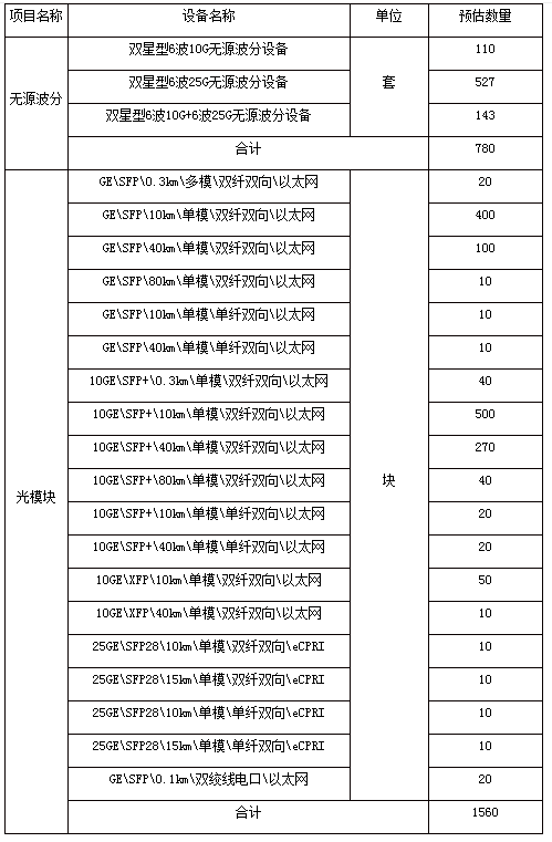 根據(jù)此前招標公告,該項目擬采購780套無源波分設備,1560個光模塊。本項目劃分為兩個標包,允許兼投兼中。
