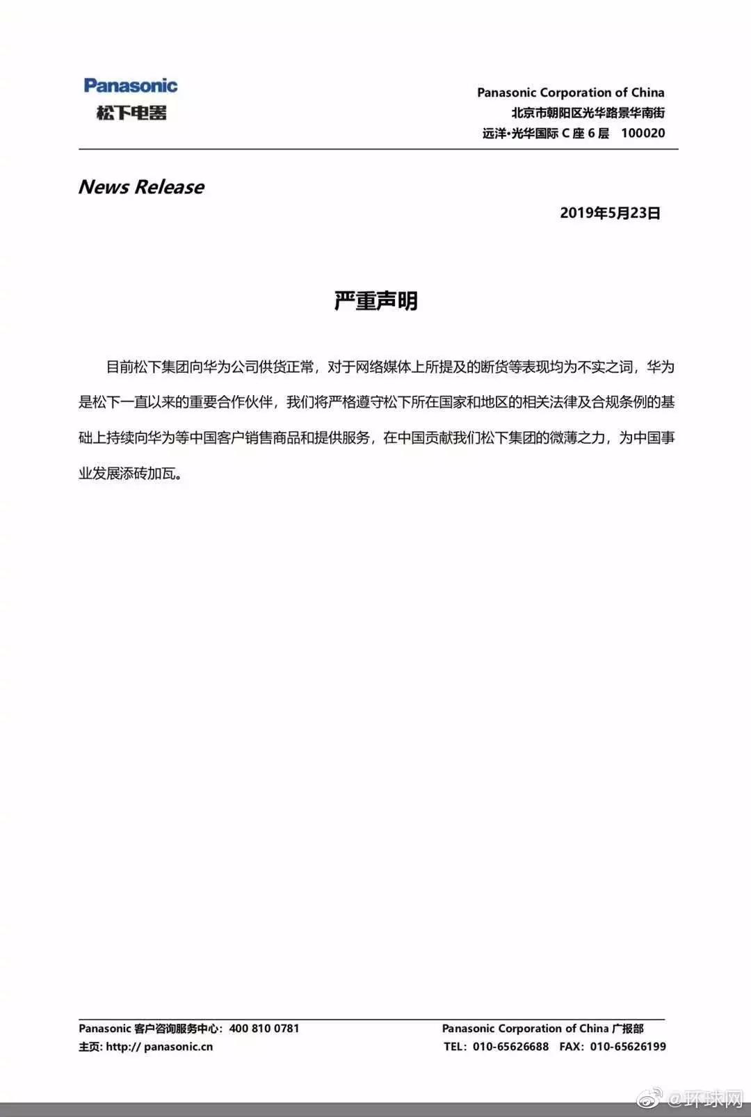 23日,環(huán)球網(wǎng)編輯部收到松下集團(tuán)發(fā)來的“嚴(yán)重聲明”,否認(rèn)“斷供華為”。