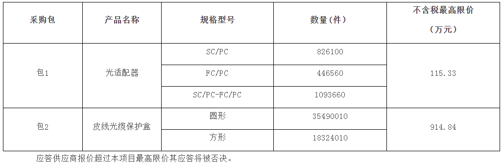 該項目擬采購裝維輔材光適配器2366320件,皮線光纜保護盒53814020件。