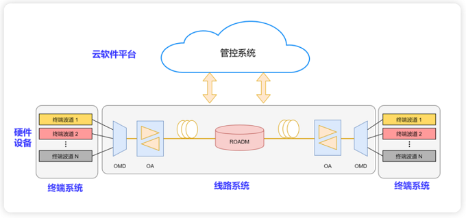 DCI網(wǎng)絡(luò)可以看成由底層硬件設(shè)備和上層管控軟件共同組成,其中設(shè)備分為光層設(shè)備和電層設(shè)備,兩者的角色類(lèi)比于城市的交通設(shè)施,光層設(shè)備類(lèi)似基礎(chǔ)道路,電層設(shè)備則是路上的交通工具。同電層技術(shù)的快速演化相比,光層設(shè)備屬于基礎(chǔ)設(shè)施中的基礎(chǔ)設(shè)施,技術(shù)演進(jìn)相對(duì)較慢,往往都會(huì)超期服役。所以,解耦的第一刀就切在這里,把公路和交通工具分割開(kāi),把光層和電層解耦。光層設(shè)備和電層設(shè)備來(lái)自不同廠(chǎng)家,同時(shí)在一套光層設(shè)備組成的“公路”上,可以支持來(lái)自不同電層設(shè)備廠(chǎng)家的“交通工具”。