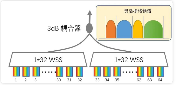 圖 6 靈活合分波單元與靈活柵格頻譜,為了支持更多的上下路端口,需要將兩個(gè)WSS進(jìn)行合并