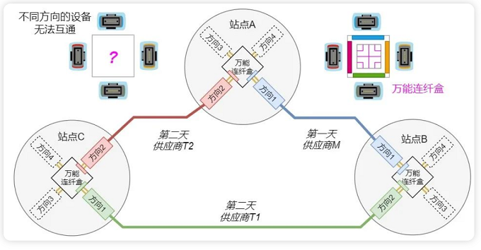 圖 8 基于萬(wàn)能連纖盒的異構(gòu)ROADM和光層解耦方案示意