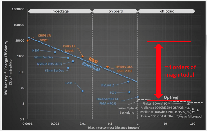在半導(dǎo)體領(lǐng)域,當(dāng)前芯片間的主要互聯(lián)方式還是基于電氣連接。隨著距離的增加,數(shù)據(jù)傳輸帶寬會(huì)急劇下降,而由此帶來的能耗則會(huì)大幅上升。下圖就展示了芯片內(nèi)部、芯片與電路板、電路板之間等不同維度下,數(shù)據(jù)傳輸帶來的帶寬損失與能耗增長(zhǎng)。可以看到,即使在板級(jí)通信時(shí)采用光纜傳輸,相比芯片內(nèi)部的傳輸速度和能效仍然下降了 4 個(gè)數(shù)量級(jí)。