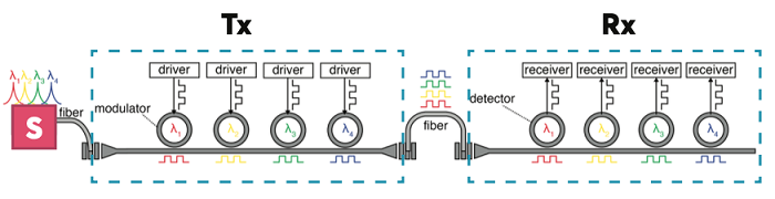 下圖展示了 TeraPHY 單個(gè)通道的收發(fā)過程,可以看到,這里采用了四種不同波長(zhǎng)的光。在發(fā)送端,利用環(huán)形諧振器將不同比特位的數(shù)據(jù)分別調(diào)制到這四種光波上,并利用光纖進(jìn)行傳輸。在接收端,再利用環(huán)形諧振器進(jìn)行解調(diào),將不同波長(zhǎng)的光信號(hào)轉(zhuǎn)化成相應(yīng)的電信號(hào)。