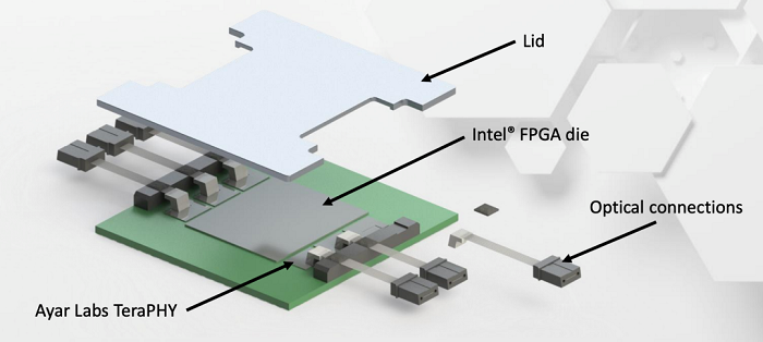 近日,一家名為 Ayar Labs 的初創(chuàng)公司展示了一款名為 TeraPHY 的光學(xué)收發(fā)器。這個(gè)光學(xué)收發(fā)器以芯粒(chiplet)的形式集成在英特爾 Stratix10 FPGA 上,可以達(dá)到 2Tbps 的數(shù)據(jù)帶寬,傳輸距離最高可達(dá) 2 公里,而傳輸功耗則不超過每比特 1pJ(10 的 -12 次方)。