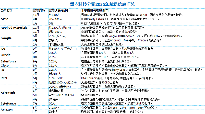 ICC訊 2025年,科技行業(yè)的裁員浪潮未見停歇,多家頭部公司為適應(yīng)市場(chǎng)變化、優(yōu)化運(yùn)營(yíng)效率并聚焦人工智能等核心戰(zhàn)略,進(jìn)行了不同規(guī)模的裁員調(diào)整。