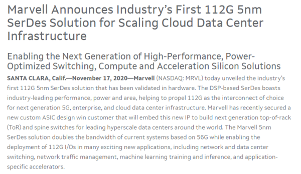 ICC訊(編譯:Nina)近日,Marvell(納斯達(dá)克:MRVL)推出了業(yè)界首款經(jīng)過硬件驗證的112G 5nm SerDes解決方案。該公司聲稱,基于DSP的SerDes具有業(yè)界領(lǐng)先的性能、功率和尺寸,有助于推動112G成為下一代5G、企業(yè)和云數(shù)據(jù)中心基礎(chǔ)設(shè)施架構(gòu)的互連選擇。Marvell最近獲得了一個新的定制ASIC Design Win客戶,該客戶將嵌入此新IP,以為全球領(lǐng)先的超大規(guī)模數(shù)據(jù)中心構(gòu)建下一代架頂式(ToR)和脊交換機(jī)。