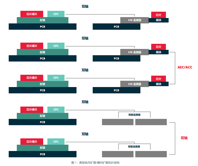 隨著串行傳輸速率提升,數(shù)據(jù)中心架構(gòu)持續(xù)演進。早期低速率場景下,PCB 與封裝損耗可忽略,連接器布置靈活;高速傳輸需求下,電纜連接器逐步向 ASIC 或處理器靠近,共封裝銅纜技術(shù)直接將銅纜集成至芯片封裝,繞過 PCB 以降低損耗,其連接器置于 ASIC 封裝上,通過雙軸電纜連接外部 I/O 或背板。