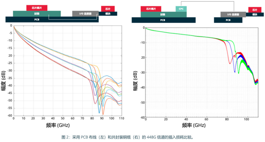 共封裝銅纜繞過 PCB 通孔與有損材料的限制,使連接器結(jié)構(gòu)成為主要帶寬瓶頸。448G 場景下,連接器需解決插配接口短截線損耗、J 型引線連接的通孔 / 焊盤短截線最小化、雙軸電纜過渡結(jié)構(gòu)寬帶化等問題。