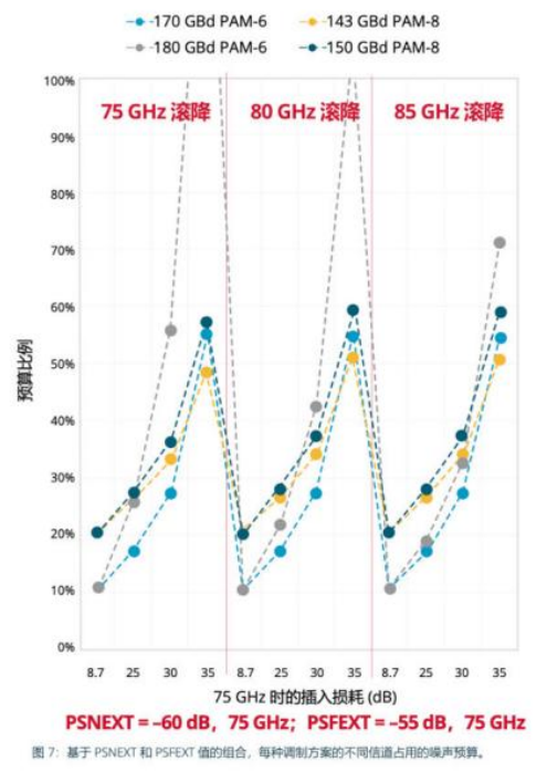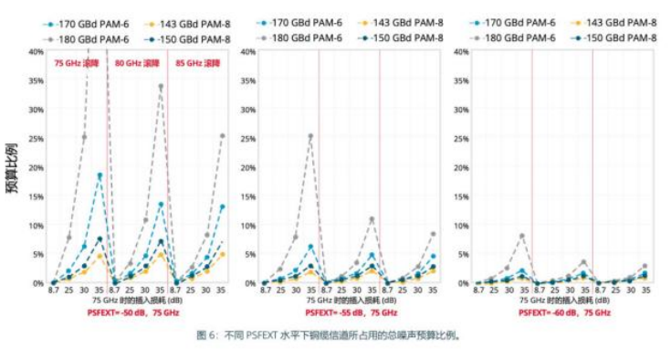 高密度連接器的相鄰信號串?dāng)_會占用噪聲預(yù)算,噪聲代價隨串?dāng)_水平降低而減弱,隨信號損耗增加而上升。共封裝銅纜因低損耗表現(xiàn)更優(yōu);PAM6 在 90 GHz 的串?dāng)_水平高于 PAM8 在 75 GHz 的表現(xiàn),承受更高噪聲代價,但信道帶寬達標(biāo)時 PAM6 性能更優(yōu)。需通過新型屏蔽技術(shù)和插配接口設(shè)計抑制串?dāng)_,提升傳輸距離。