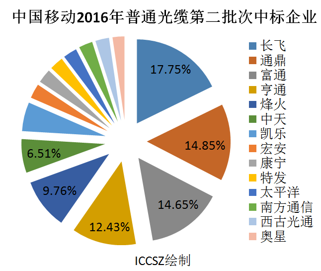 ICCSZ訊 7月1日消息,中國移動發(fā)布2016年普通光纜產(chǎn)品集采項目(第二批次)中標名單,14家光纜廠商成功中標該項普通光纜項目,長飛以17.75%份額成為中標榜首,通鼎和富通分列二三位。具體份額排名如下:
