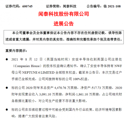 ICC訊 8月15日消息,今日聞泰科技發(fā)布進(jìn)展公告,2021 年 8 月 12 日(英國當(dāng)?shù)貢r(shí)間)安世半導(dǎo)體收到英國公司注冊處(Companies House)的股東權(quán)益確認(rèn)通知書,確認(rèn)了安世半導(dǎo)體持有NWF 母公司NEPTUNE 6 LIMITED 全部股東權(quán)益。截至本公告日,本次交易過戶手續(xù)已全部完成,公司間接持有NWF 100%權(quán)益。