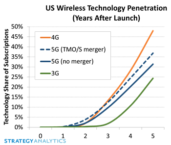 · Strategy Analytics預(yù)計(jì),T-Mobile / Sprint用戶賬號(hào)市場份額增長將會(huì)與Verizon和AT&T相對(duì)持平。 然而,Verizon的收益更加依賴后付費(fèi)市場,而預(yù)測期內(nèi)5G的加速發(fā)展將主要在后付費(fèi)市場。這將使其在收益方面受到合并的輕微影響。