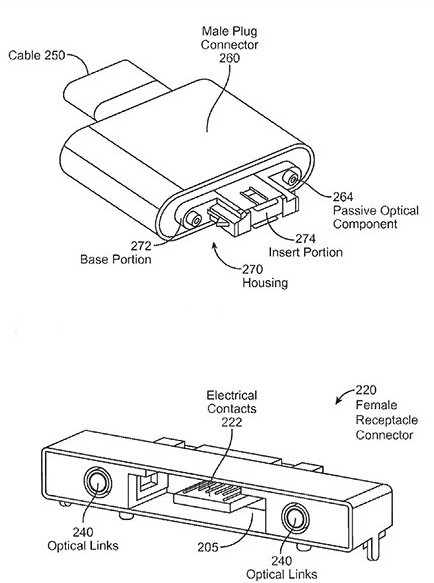 與光纖相比,傳統(tǒng)的電到傳輸方式卻非常普遍的使用。蘋(píng)果在專利中試圖將這兩種技術(shù)的優(yōu)點(diǎn)結(jié)合在一起,提出精簡(jiǎn)、兼容性高的解決方案。基本上來(lái)說(shuō),專利中提到的技術(shù)要比目前存在的技術(shù)高級(jí)一些,專利中提及的連接器可以同時(shí)傳輸電信號(hào)和光信號(hào)。