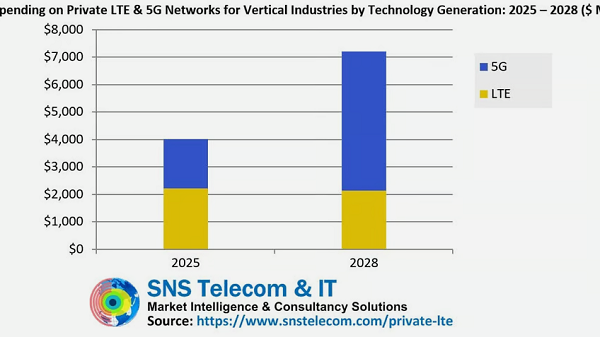 ICC訊 市場研究公司SNS Telecom & IT在其第四季度市場報告中指出:“2025年是私有LTE/5G市場的轉型之年,5G部署在許多垂直行業(yè)已超越LTE?!痹摴颈硎荆骸拔覀冾A計,2025年至2028年間,全球垂直行業(yè)私有LTE和5G網(wǎng)絡基礎設施支出將以約22%的年復合增長率(CAGR)增長,到2028年底最終將超過72億美元?!?