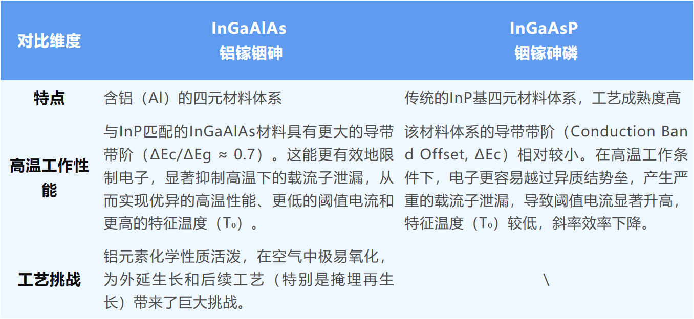 除了波導(dǎo)結(jié)構(gòu)設(shè)計,有源區(qū)材料體系的選擇對激光器性能,尤其是高溫性能,起著決定性作用。目前,有兩種主流有源區(qū)材料:InGaAlAs (鋁鎵銦砷)和InGaAsP (銦鎵砷磷),下表對比了兩種材料體系的優(yōu)缺點: