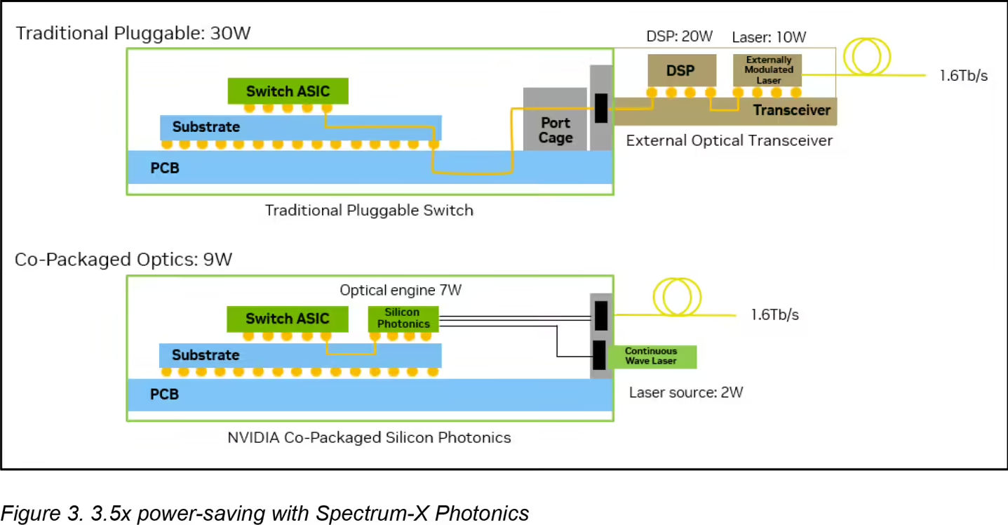 相比傳統(tǒng)可插拔光模塊,CPO 減少組件數(shù)量并提升系統(tǒng)可靠性外,還可以將信號(hào)損耗從 22 分貝降至 4 分貝,單端口功耗從 30 瓦降至 9 瓦。