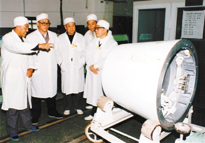 陳定昌(右一)任原航空航天工業(yè)部第二研究院院長(zhǎng)期間深入車間