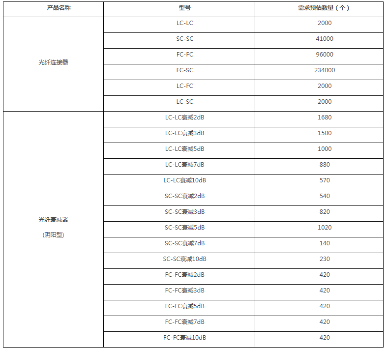 應答人須提供經(jīng)CMA認證的第三方檢測機構(gòu)出具的針對本次應答產(chǎn)品所有型號的質(zhì)量檢測報告掃描件(須加蓋第三方檢測機構(gòu)有效印章)。檢測指標光纖連接器插入損耗≤0.2db;光纖衰減器衰減值≤5db時,衰減變化量≤0.5db;光纖衰減器衰減值(A)>5db時,衰減變化量≤A*0.1db。