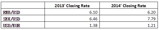 解讀之前需要說明的是,這五大通信廠商總部分處不同國家,因此財(cái)報(bào)數(shù)據(jù)所用貨幣單位也各不相同:華為和中興采用人民幣,愛立信采用瑞典克朗,諾基亞和阿朗采用歐元。為便于比較,按照各廠家財(cái)報(bào)里使用的如下年終記賬匯率統(tǒng)一折算為第三方貨幣,以美元來核算: