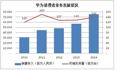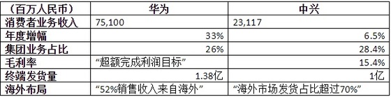 3、華為、中興2014年消費(fèi)者業(yè)務(wù)收入對比