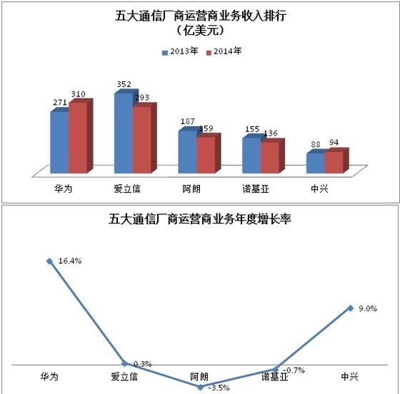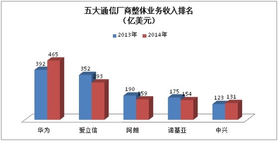 2、五大通信廠商2014年運(yùn)營商業(yè)務(wù)收入排名對比