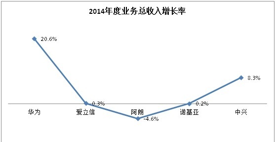 在公司整體業(yè)務(wù)收入上與2013年相比,五大通信廠商在2014年的排名沒有發(fā)生任何變化,華為繼2013年實(shí)現(xiàn)對愛立信的超越之后在2014年進(jìn)一步加大了領(lǐng)先優(yōu)勢,排在最后的中興與夾在中間的歐洲三強(qiáng)之間的差距也在進(jìn)一步減少。再橫向?qū)Ρ任宕?A href="http://www.objetivogol.com/site/CN/Search.aspx?page=1&keywords=%e9%80%9a%e4%bf%a1%e5%8e%82%e5%95%86&column_id=ALL&station=%E5%85%A8%E9%83%A8" target="_blank">通信廠商基于本幣的年度增長率,也可以看到華為與中興在2014年的增長幅度遠(yuǎn)遠(yuǎn)大于停滯不前的歐洲三強(qiáng),此消彼長之間中國廠商對歐洲三強(qiáng)兩頭夾擊的勢頭非常明顯。