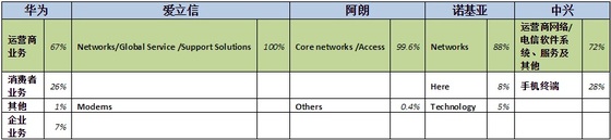 公司的整體業(yè)務(wù)收入對比在某種程度能夠體現(xiàn)五大通信廠商的業(yè)務(wù)規(guī)模的對比,但由于各個(gè)公司戰(zhàn)略導(dǎo)向差異而導(dǎo)致其業(yè)務(wù)布局的不同,僅僅比較整體業(yè)務(wù)收入難以直接體現(xiàn)出各公司在相同市場、重合業(yè)務(wù)上的競爭實(shí)力對比,因此需要進(jìn)一步細(xì)化到業(yè)務(wù)架構(gòu)細(xì)分對比。具體而言,五大通信廠商不同業(yè)務(wù)布局的收入占比情況如下表所示: