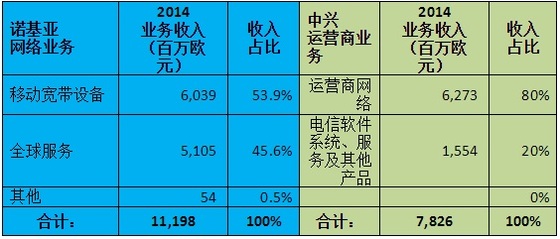 至于中興,雖然在中國市場的運(yùn)營商業(yè)務(wù)占據(jù)主場之利而超過歐洲三強(qiáng)一頭,但按照全球范圍的運(yùn)營商業(yè)務(wù)收入排名在五大通信廠商中依然墊底。中興在其財(cái)報(bào)數(shù)據(jù)發(fā)布之后曾統(tǒng)一稿源宣傳自己“在系統(tǒng)設(shè)備銷售收入上首超諾基亞,成為行業(yè)第四”,則純屬傲嬌了。業(yè)內(nèi)周知,運(yùn)營商與通信廠商的大型采購采購項(xiàng)目一般均為系統(tǒng)合同,除從通信廠商購買硬件、軟件等系統(tǒng)設(shè)備之外,還會包括交鑰匙工程的安裝、集成服務(wù)以及維保服務(wù)等服務(wù)產(chǎn)品。通信廠商會按一定的財(cái)務(wù)原則對銷售合同所含的產(chǎn)品和服務(wù)內(nèi)容做不同口徑的銷售確認(rèn),因此具體比較一下諾基亞的網(wǎng)絡(luò)業(yè)務(wù)分部與中興的運(yùn)營商網(wǎng)絡(luò)分部和電信軟件系統(tǒng)、服務(wù)及其他產(chǎn)品分部在2014年的業(yè)務(wù)收入細(xì)分,則其間差異一目了然(核算口徑統(tǒng)一按照中興文稿所注的歐元兌人民幣2014年年終匯率中間價(jià)7.456計(jì)算):