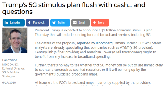 彭博社(Bloomberg)報道稱,該提議的細節(jié)仍不清楚。但華爾街分析師已經(jīng)在預測,諸如AT&T(一家5G提供商)、CenturyLink(一家光纖服務提供商)和American Tower(一家蜂窩基站運營商)這樣的公司應該會從寬帶支出增長中受益。然而,人們無法判斷5G資金是否能立即用于應對冠狀病毒引發(fā)的經(jīng)濟衰退,或者是否會被政府過時的寬帶地圖擱置。
